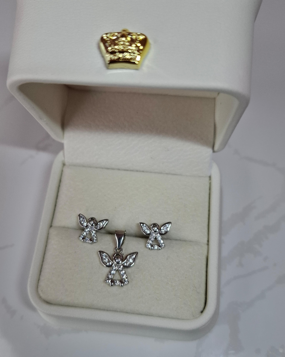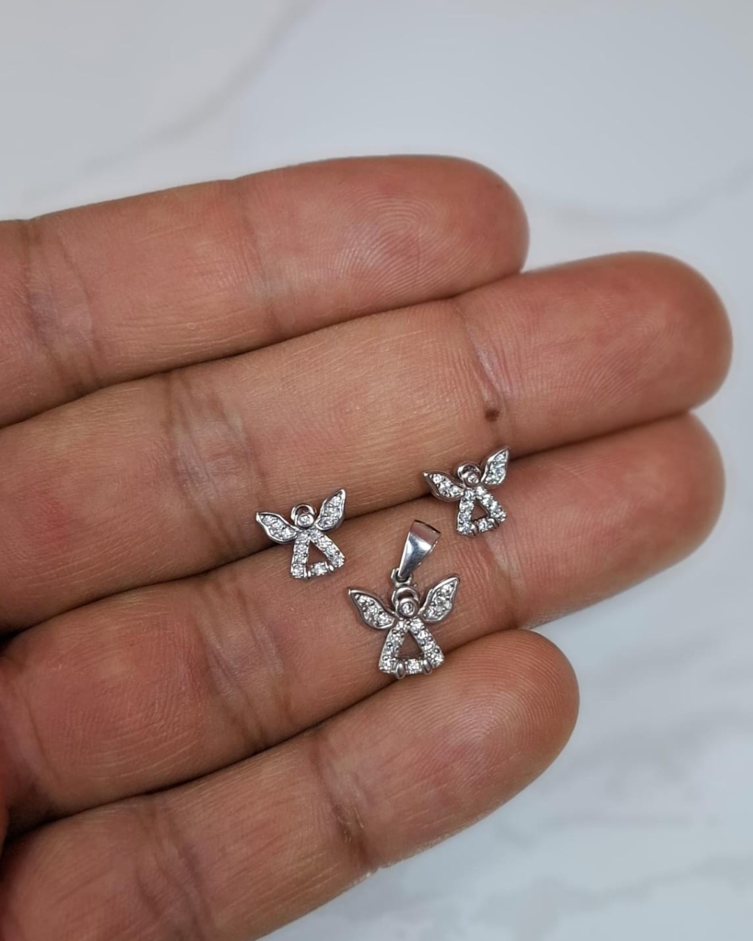 Estos elegantes topes y dije en plata con diseño de ángel, adornados con circones suizos, combinan delicadeza y brillo para realzar tu estilo. Perfectos para quienes buscan un accesorio sofisticado que aporte un toque celestial y luminoso a cualquier ocasión. Su acabado en plata garantiza durabilidad y un look siempre impecable.